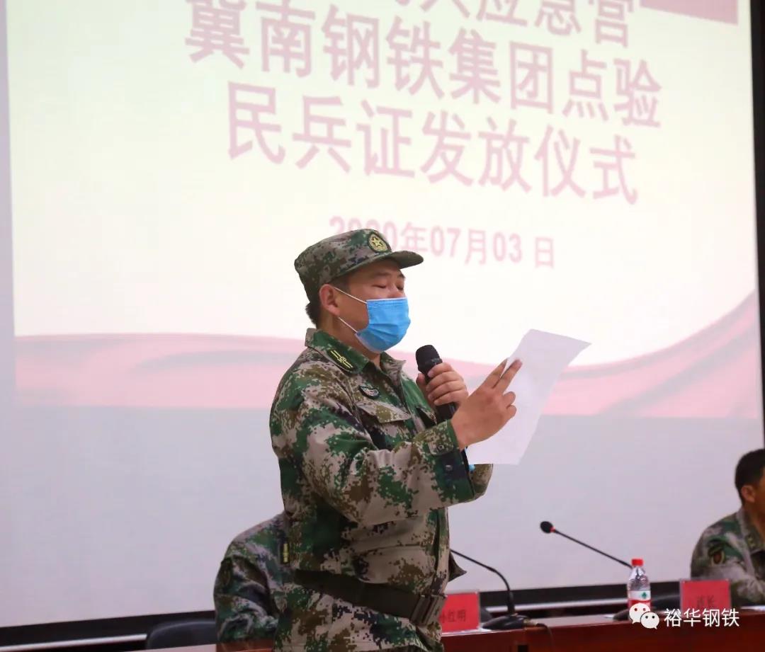 7月3日上午,邯鄲市民兵應(yīng)急營在冀南鋼鐵集團(tuán)召開了2020年民兵應(yīng)急營點(diǎn)驗(yàn)大會,邯鄲市民兵應(yīng)急營營長范濤,邯鄲市軍分區(qū)政治處領(lǐng)導(dǎo),邯鄲市民兵訓(xùn)練基地領(lǐng)導(dǎo),公司黨委委員、工會副主席孫紅明,安全部副部長李海軍及全體民兵參會。