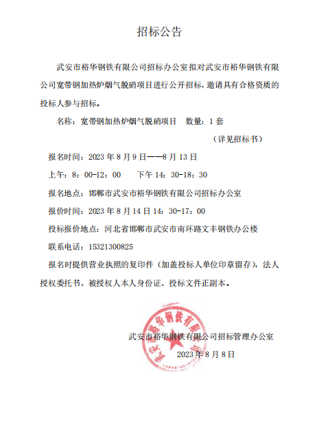 寬帶鋼加熱爐煙氣脫硝項(xiàng)目 招標(biāo)公告